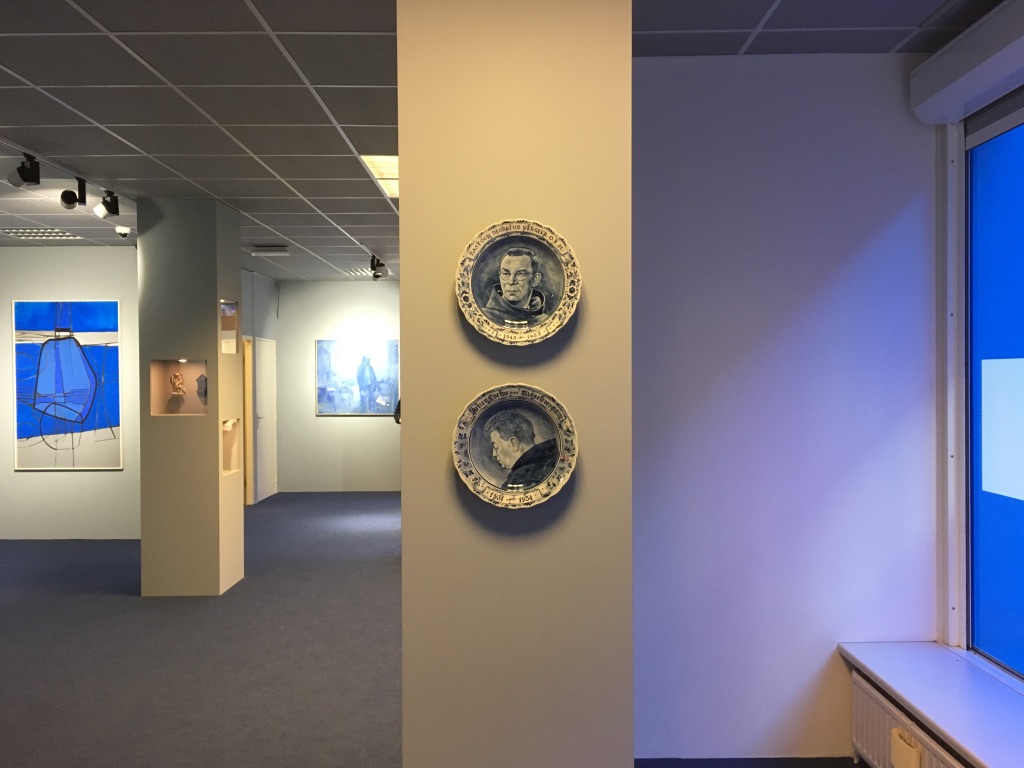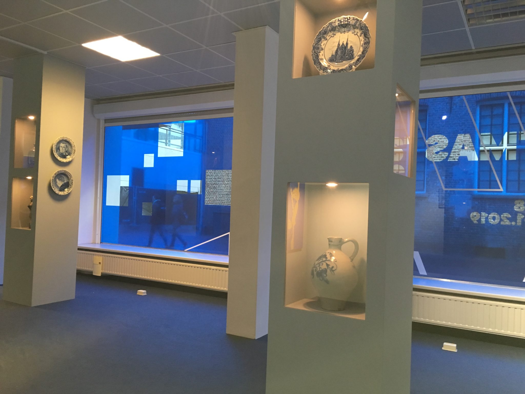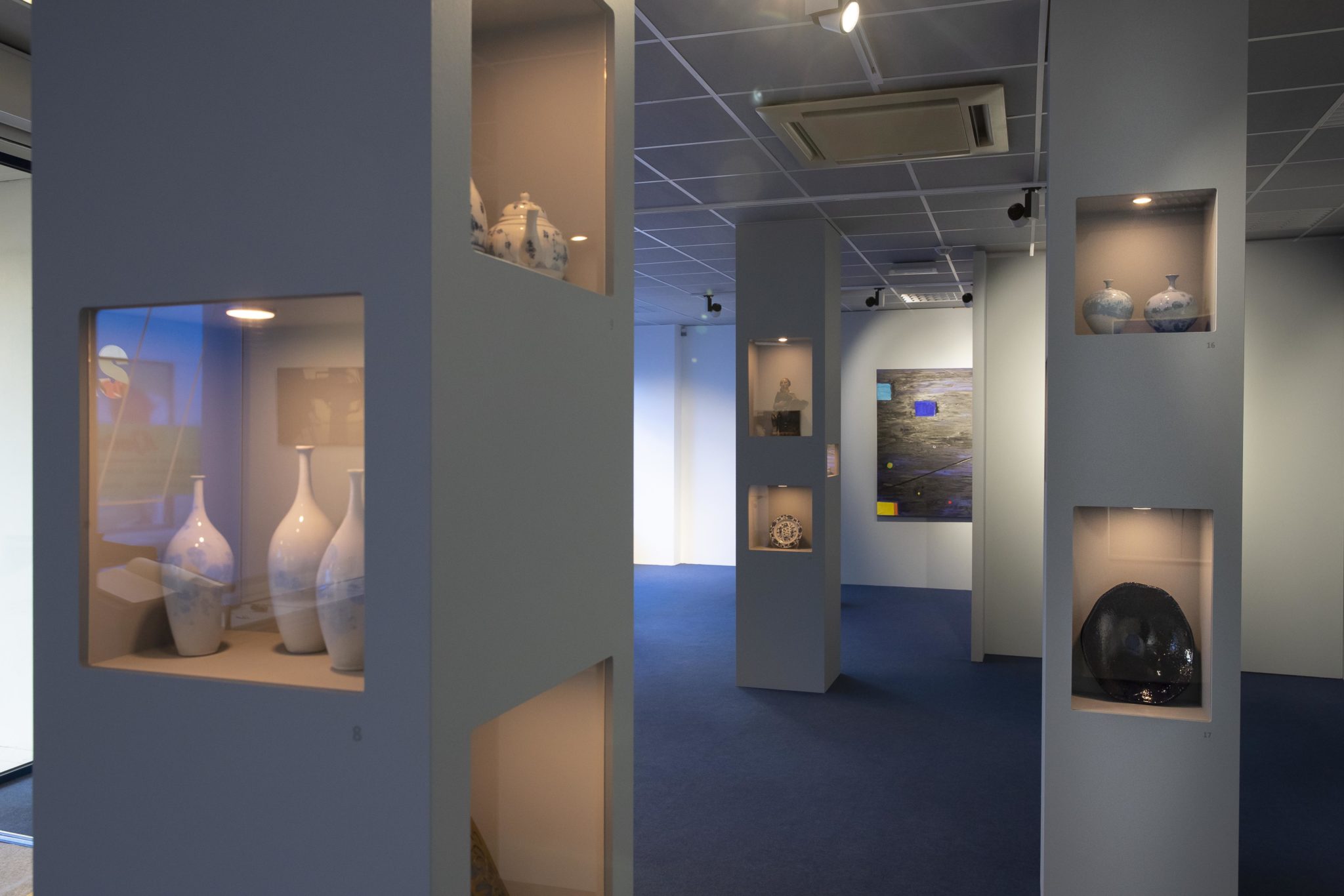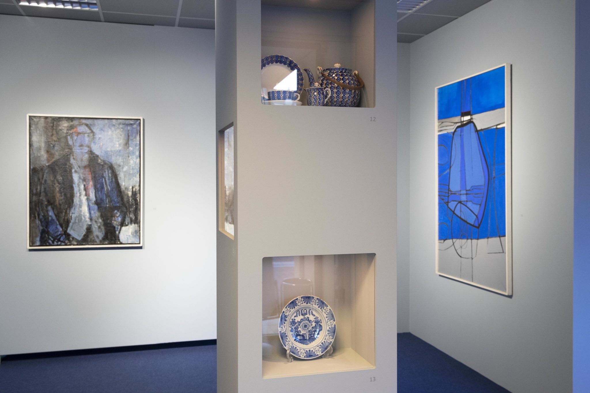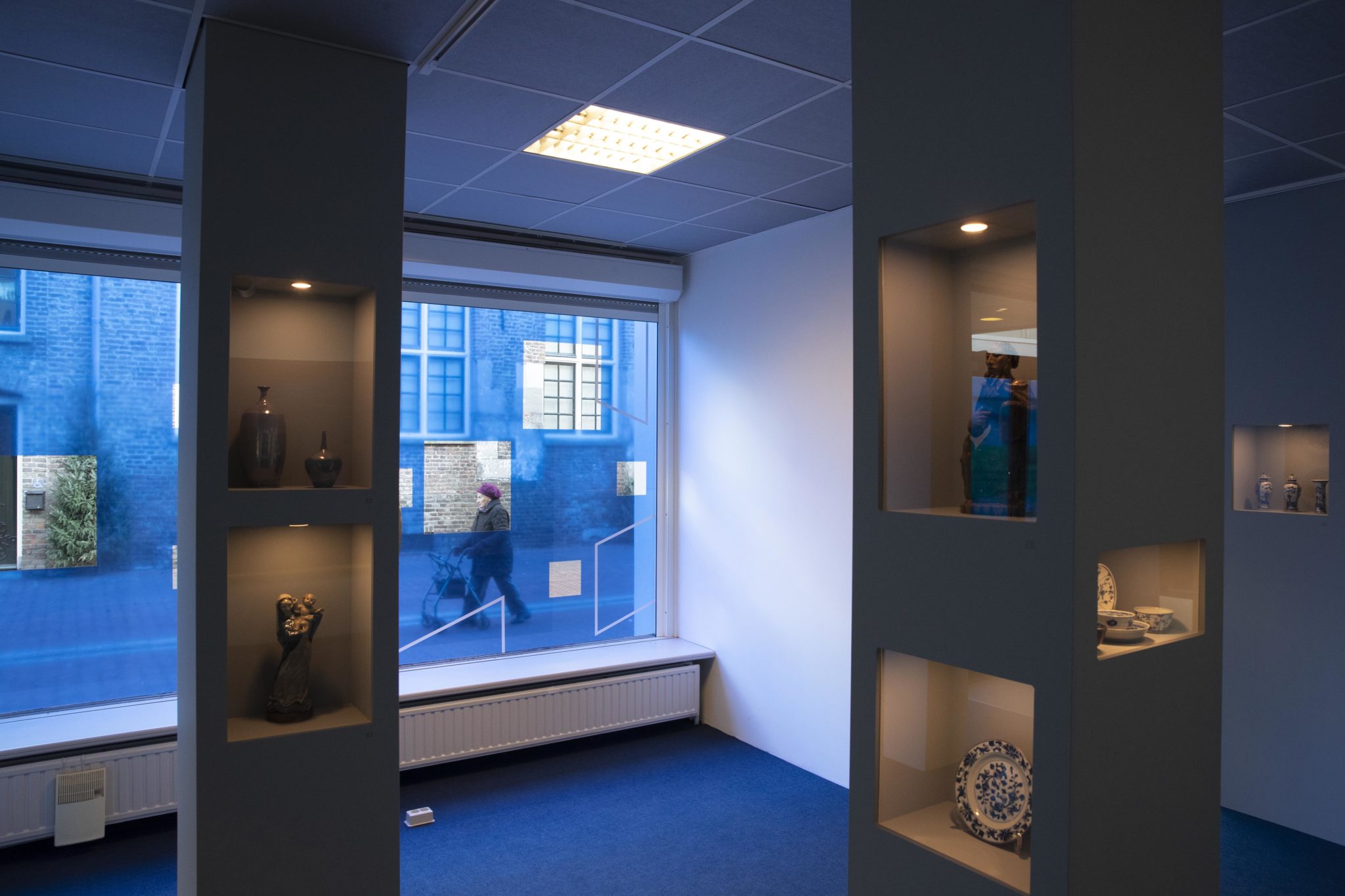 Als vormgever van deze tentoonstelling in een oud winkelpand probeerde ik de kleur blauw te infiltreren in de tentoonstelling op een subtiele maar ook onmisbare manier. De wijze waarop dit gestalte kon krijgen was door de ramen vrijwel in zijn geheel te laten beplakken met een transparante blauwe folie. De ruimte binnen kreeg -van buitenaf gezien- in zijn geheel een blauwe gloed. Als men andersom, van binnen naar buiten keek door de grote raampartijen, dan werd de wereld buiten ook transparant blauw. De blauwe gloed in de tentoonstellingsruimte was zacht en niet zo dominant dat de collectiestukken van kleur veranderden. De hoeveelheid zonlicht bepaalde de blauwe gloed op de witte en grijze muren in de ruimte. Een tweede belangrijk vertrekpunt was het lelijke systeemplafond. Het kon niet weg, en ‘ontkennen’ kon ook niet. Het inzetten in de vormgeving van de tentoonstelling was de mijns inziens de beste oplossing. Het ontwerp van de 7 vitrines is dan ook zo gemaakt dat ze van de vloer af verdwenen in het plafond. Ze hadden dan ook hetzelfde formaat als de plafondtegels en werden geplaatst in het stramien van het plafondsysteem. De muren en vitrinezuilen zijn zachtgrijs geschilderd, op de vloer een blauw tapijt over de houten OSB-vloer.