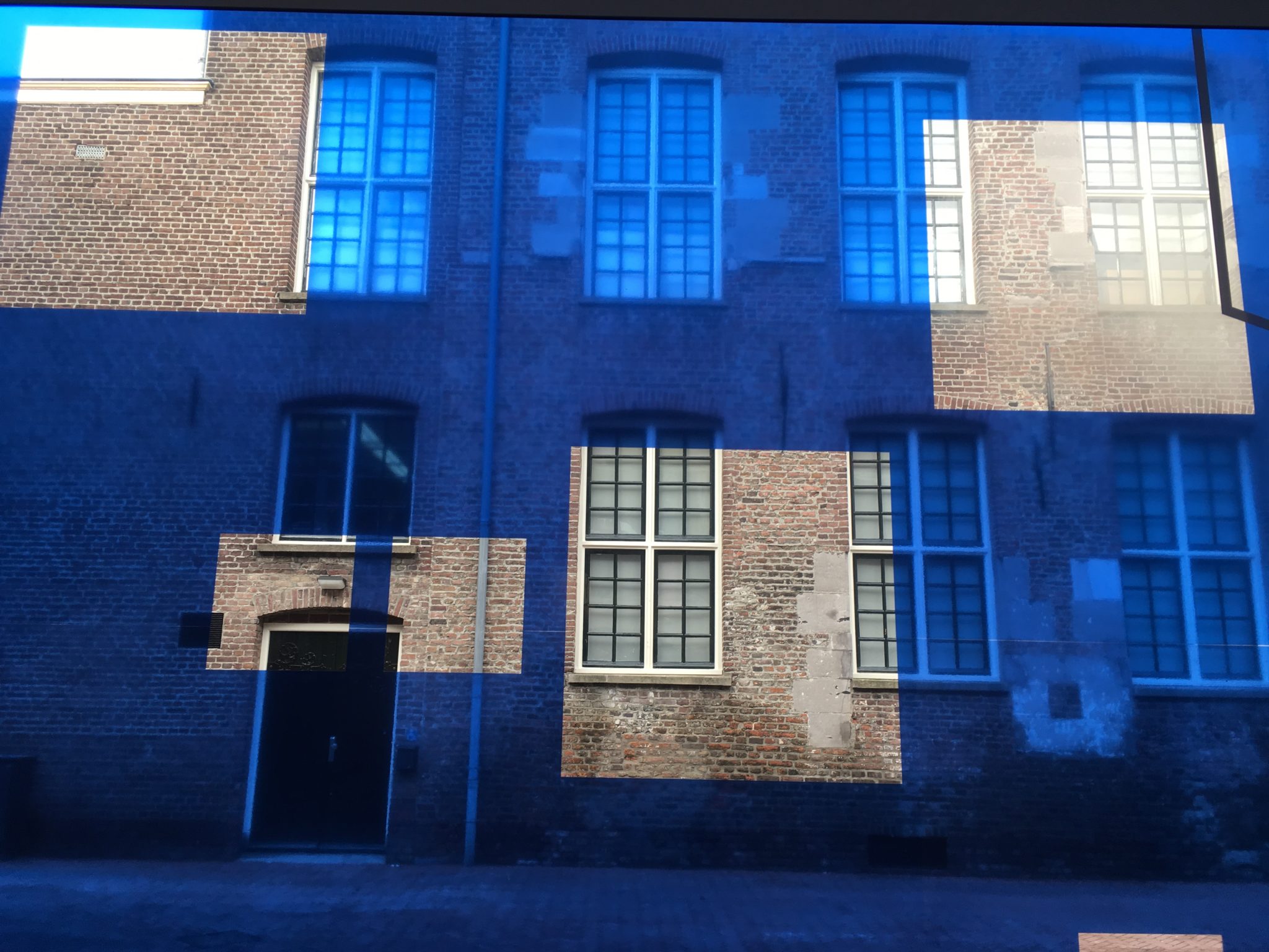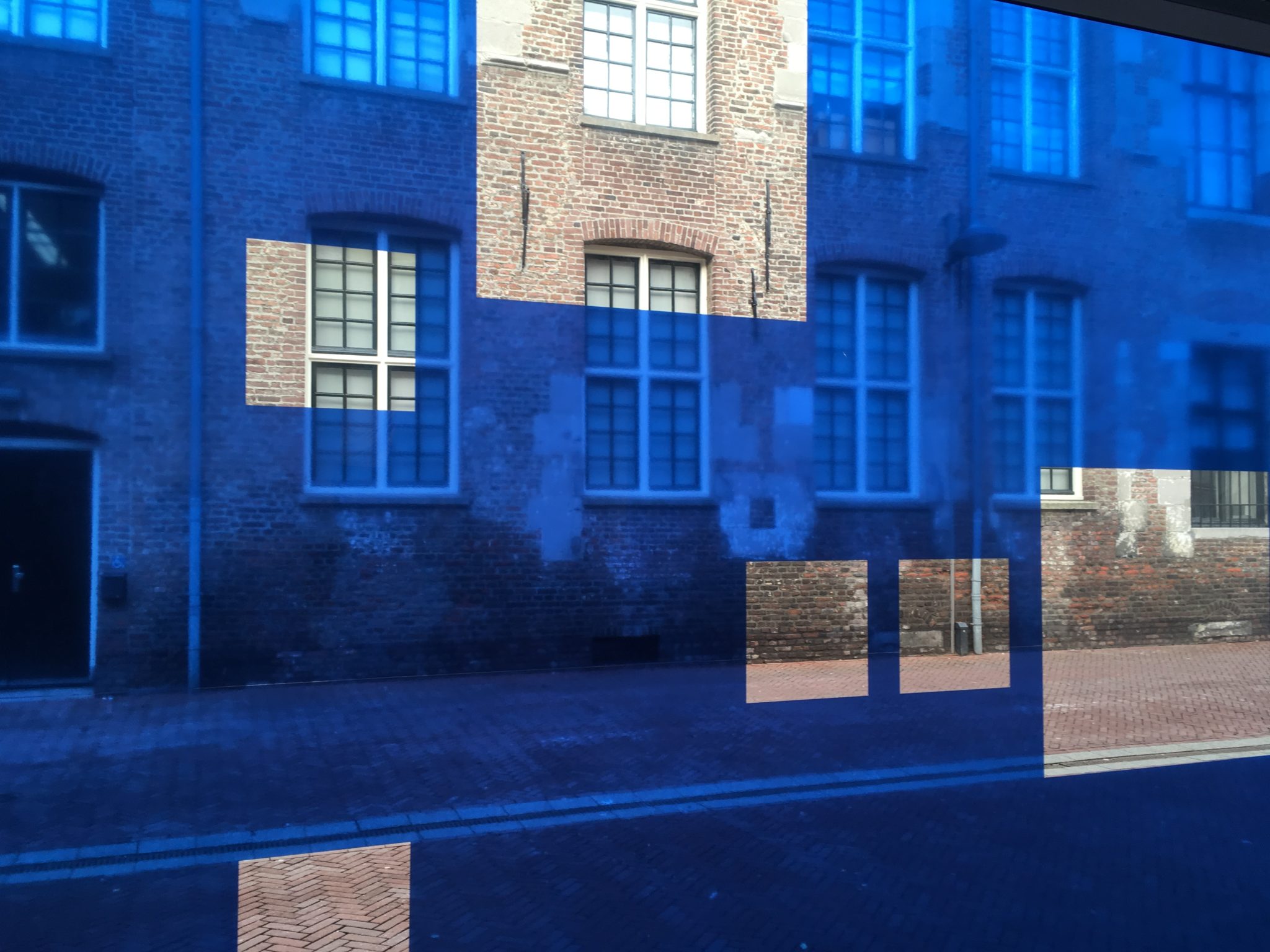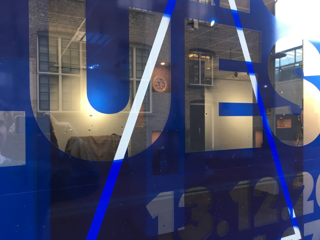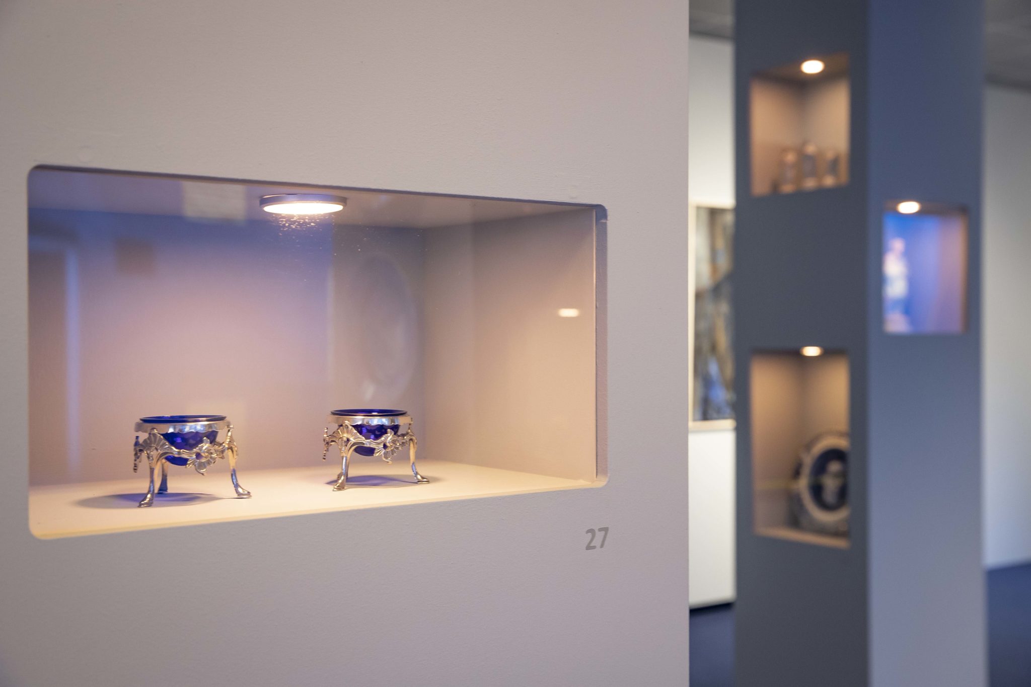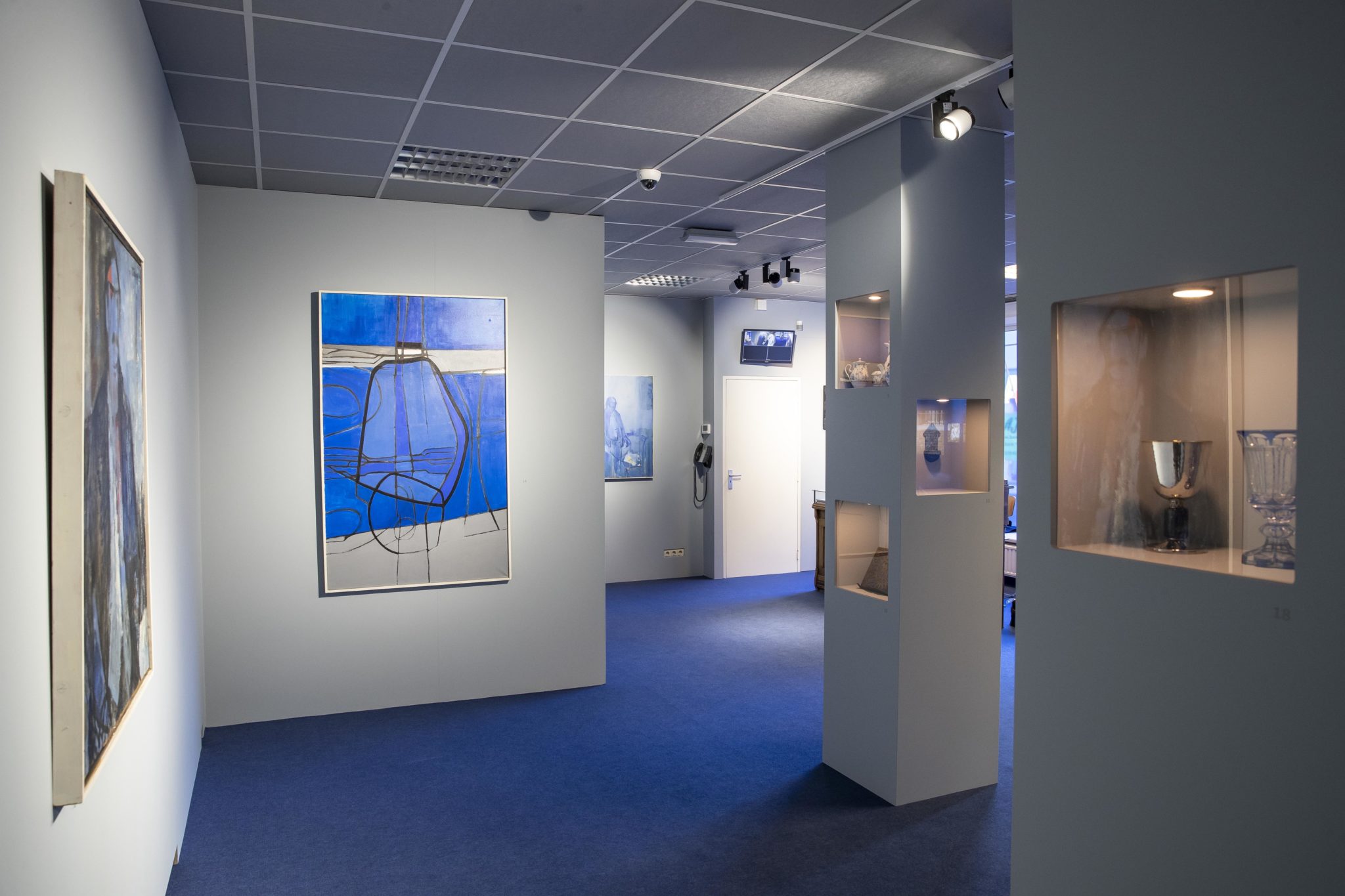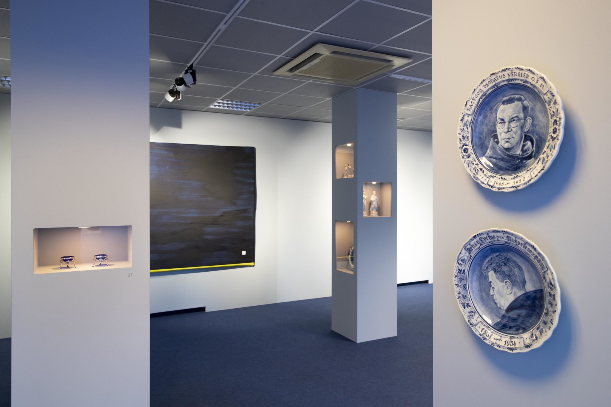 Als vormgever van deze tentoonstelling in een oud winkelpand probeerde ik de kleur blauw te infiltreren in de tentoonstelling op een subtiele maar ook onmisbare manier. De wijze waarop dit gestalte kon krijgen was door de ramen vrijwel in zijn geheel te laten beplakken met een transparante blauwe folie. De ruimte binnen kreeg -van buitenaf gezien- in zijn geheel een blauwe gloed. Als men andersom, van binnen naar buiten keek door de grote raampartijen, dan werd de wereld buiten ook transparant blauw. De blauwe gloed in de tentoonstellingsruimte was zacht en niet zo dominant dat de collectiestukken van kleur veranderden. De hoeveelheid zonlicht bepaalde de blauwe gloed op de witte en grijze muren in de ruimte. Een tweede belangrijk vertrekpunt was het lelijke systeemplafond. Het kon niet weg, en ‘ontkennen’ kon ook niet. Het inzetten in de vormgeving van de tentoonstelling was de mijns inziens de beste oplossing. Het ontwerp van de 7 vitrines is dan ook zo gemaakt dat ze van de vloer af verdwenen in het plafond. Ze hadden dan ook hetzelfde formaat als de plafondtegels en werden geplaatst in het stramien van het plafondsysteem. De muren en vitrinezuilen zijn zachtgrijs geschilderd, op de vloer een blauw tapijt over de houten OSB-vloer.