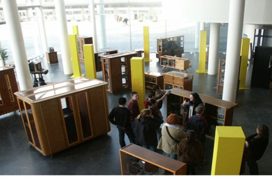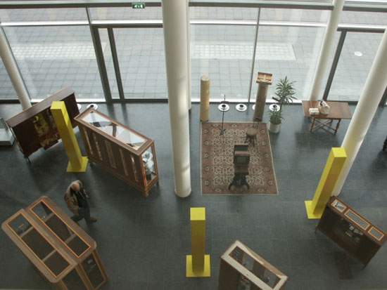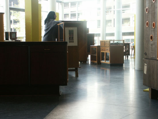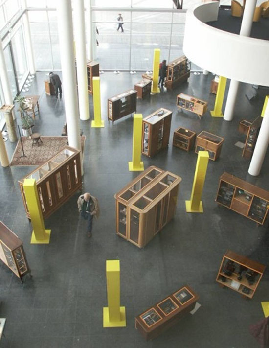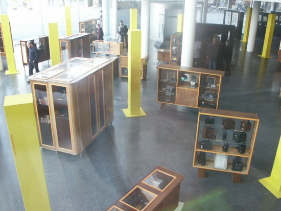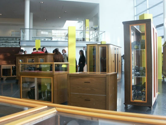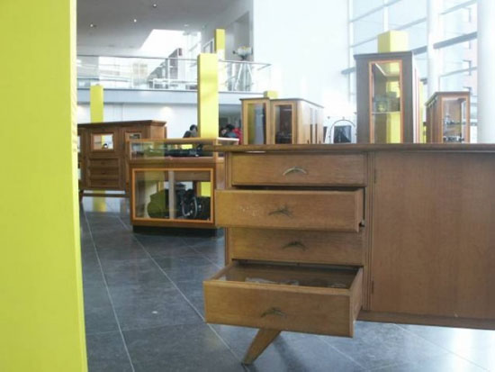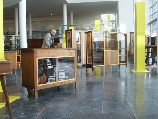 De vitrines waren omgebouwde tweedehandse kasten, van uiteenlopende soorten en met diverse functies. De houten kasten contrasteerden mooi met de strakke glazen architertuur van de hal, de kasten verwezen naar het verzamelkarakter van de leden van Fotografica, en vroegen door de verschillende ‘ombouwen’ om een actieve manier van kijken.